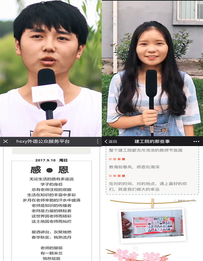 言传身教,无私奉献。校团委、各学院团总支以线上线下方式发起“老师,我想对您说”微信、微博述真情活动和校新媒体中心组织学生拍摄的专题视频,吸引了全校师生的广泛参与,学生们纷纷利用课余时间与自己最喜爱的老师进行“真情告白”。“我记得当初第一次上方老师的课的时候,连上四节,老师上完第一节课的时候嗓子已经有点嘶哑了,但她还是坚持把课给我们上完......”;“老师,很开心有你的教导,也希望未来的日子继续在你的教导下,好好的学习......”;“希望老师能继续深造下去,他是个挺不错的老师......”,“老师是每个人人生的引路人,感谢他们为我们的付出......”同学在微博、微信后台的留言和视频中的真情诉说,表达了对自己喜爱老师的深情厚意,用自己的语言描绘对老师的深深祝福。