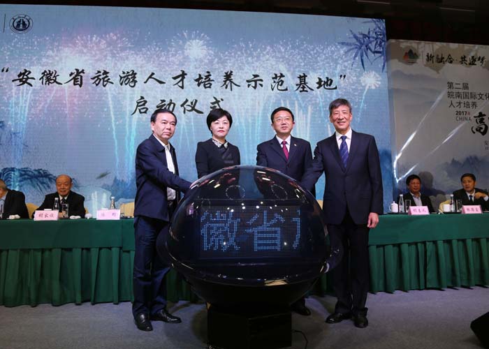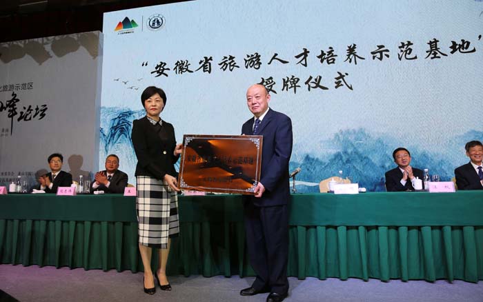 安徽省旅游发展委员会副主任王靖和副校长胡家俊共同为我市首个旅游人才培养示范基地揭牌