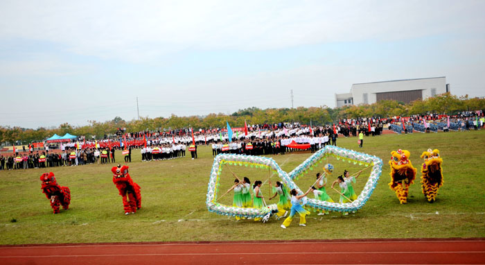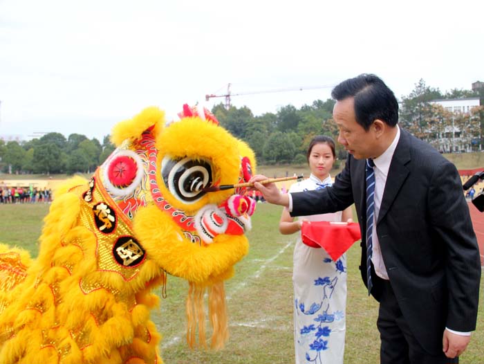 体育学院精彩的舞龙舞狮表演将开幕式气氛推向高潮。在激越高亢的音乐声中,一条蜿蜒的巨龙与四只威武的狮子活灵活现,交相辉映,将龙狮精神展现得淋漓尽致,赢得现场观众阵阵喝彩。