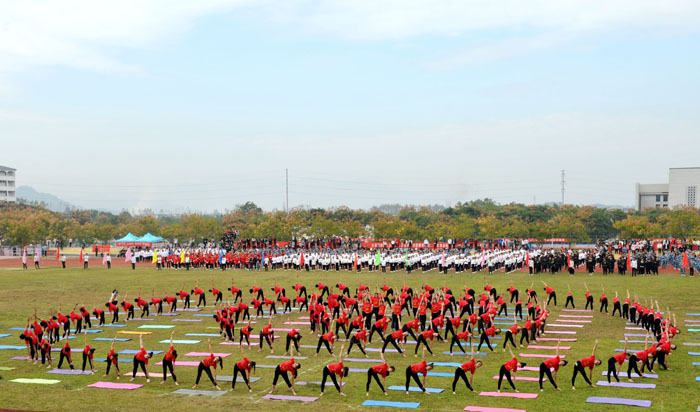 在《我和你》柔美的旋律中,来自体育、艺术、文传、旅游、经管、数统、教育、化学、外语、信息等共计10个学院的144名同学组成方阵表演了瑜伽。