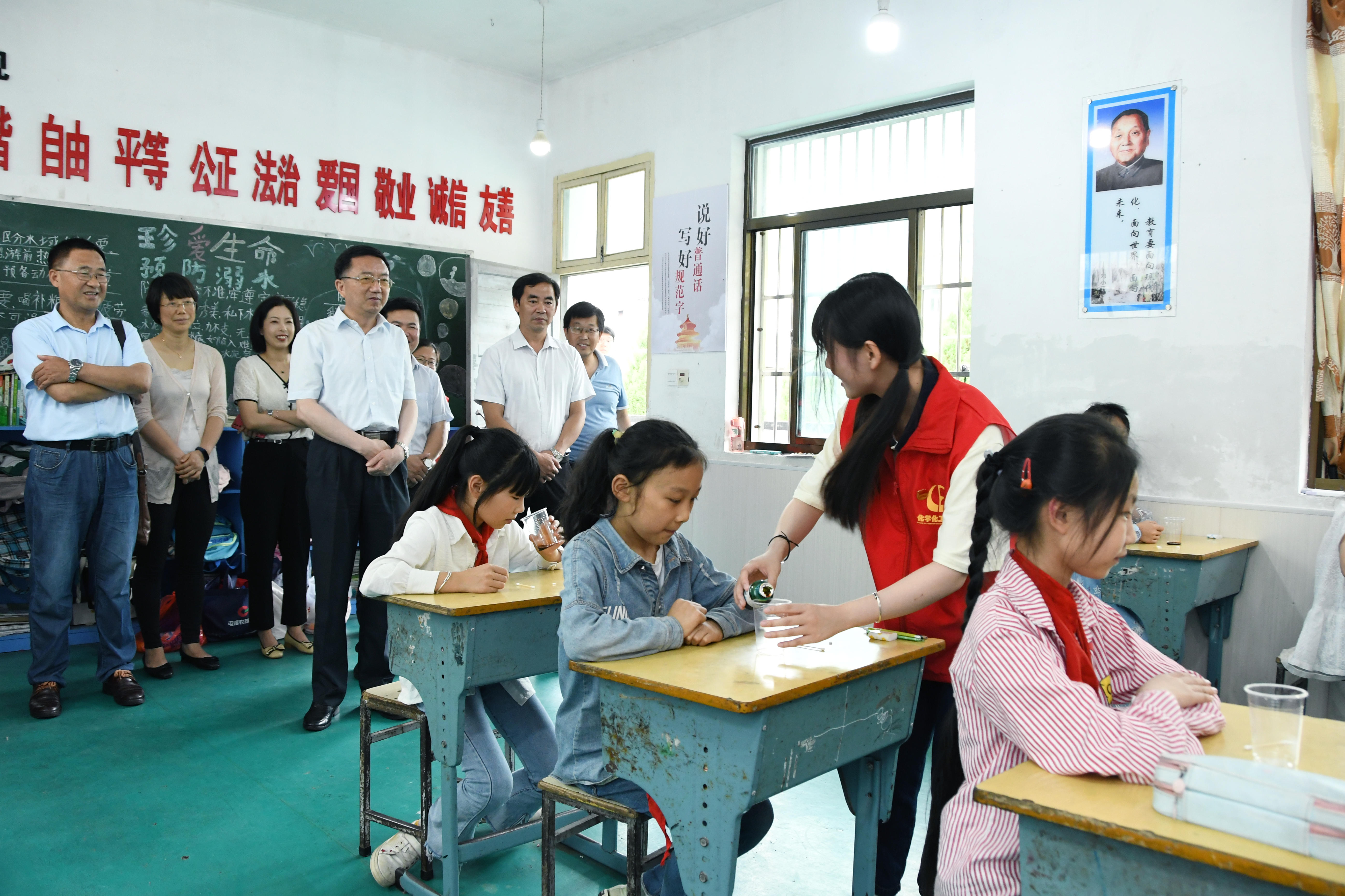 在歙县溪头镇,汪枫一行看望了“追寻革命老区,探访红色乡村振兴路”实践服务团队。该团队在大谷运中学开展安全用药和防疫科普知识宣传、“科学实验进校园”活动,并在鸿志茶庄参与茶叶取样检测、包装等工作。汪枫和该实践服务团队的师生亲切交谈,详细了解他们的衣食住行和工作开展情况,叮嘱他们要注意防暑和安全。汪枫还现场观摩了“大象牙膏”“可乐变雪碧”化学趣味实验课,认真聆听同学们难忘的实践心得和成长体会,他对该团队成员们认真负责,不怕苦不怕累的精神给予高度肯定。他指出,暑期“三下乡”社会实践活动是同学们运用知识、施展才华、磨练意志、实践成才的大课堂,同学们一定要珍惜宝贵机会,发扬吃苦耐劳精神,坚持精益求精的态度,在实践中磨练意志,增强本领,把自己的所学、所长运用于实践,服务于社会和人民。