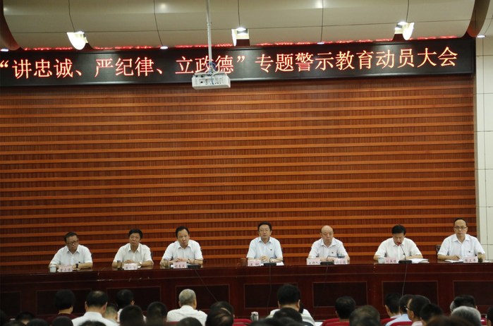 7月4日下午,我校在率水校区逸夫图书馆二楼报告厅召开“讲忠诚、严纪律、立政德”专题警示教育动员大会。校党委书记汪枫,党委副书记胡家俊,副校长胡善风,党委委员、副校长刘英旺出席会议,全体处级党员领导干部、各分党委(党总支)纪检委员、党支部书记参加会议。胡家俊主持会议。