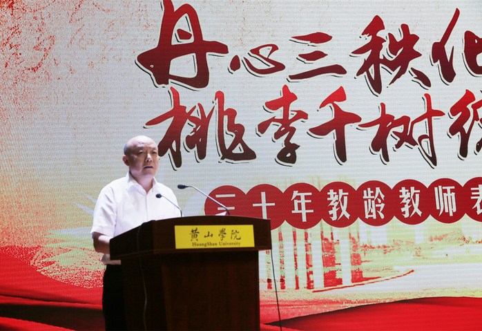 会上,汪枫发表了热情洋溢的讲话。在讲话中,汪枫向辛勤耕耘在教育战线上的广大教师和教育工作者表示节日的问候和诚挚的祝福,向受表彰的三十年教龄教师们表示热烈的祝贺和衷心的感谢。他充分肯定受表彰的教师为学校建设发展作出的贡献,盛赞他们三十年来不忘初心,大爱与责任并存;不改初心,坚守与执着同在;不负初心,青春与奉献共行。他说,三尺讲台,三十年坚守和付出,三十年教龄教师是教学一线的老兵,他们用拳拳爱心与真情温暖了学生的灵魂。汪枫指出,新时代做一名“立德树人、敬业兴教”的好老师,一要以德育人,修身立德,塑造崇高人格魅力。坚定理想信念,切实增强担当意识、使命意识和进取意识。坚守职业信仰,忠诚事业,始终保持脚踏实地、无私奉献的敬业精神和淡泊名利、甘为人梯的崇高境界。坚持职业操守,铸就良好德行,当好引路人,指引学生成长、成人、成才。二要以学启人,厚积薄发,铸就过硬专业本领。潜心教书、静心研究、严谨治学,注重知识储备,真正成为知识和文化的代表。勇于探索、善于钻研,持之以恒地开展教学研究,增强专业素质,用先进的理念、科学的方法,提高育人本领;与时俱进、锐意创新,努力营造开放、现代、挑战的活力课堂,赢得学生的尊重和爱戴。三要以文化人,春风化雨,构建和谐育人生态。以文育人,让优秀徽州传统文化、皖南红色文化和社会主义先进文化,有机融入课堂、融入活动、融入校园,凝练大学精神,为学生“树魂、立根、打底色”。守护心灵,关注学生内心世界,善于发现、发掘学生闪光点,赏识、鼓励学生的点滴进步。爱满天下,诲人不倦、循循善诱,始终保持爱生如子的园丁情怀,用无私的大爱温暖学子心灵、照亮未来人生。他希望全体教师以树人为根本,立德当表率,立教作贡献,不忘初心、砥砺前行,以优异的成绩迎接教育部本科教学工作审核评估,迎接我校第三次党代会召开,不断开创博业体育(中国)官方网站-登录入口更加美好的未来。