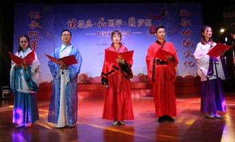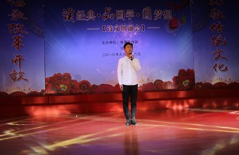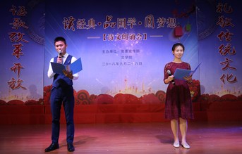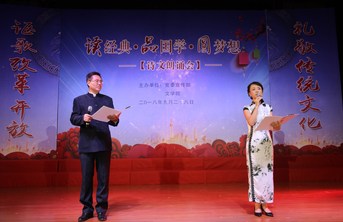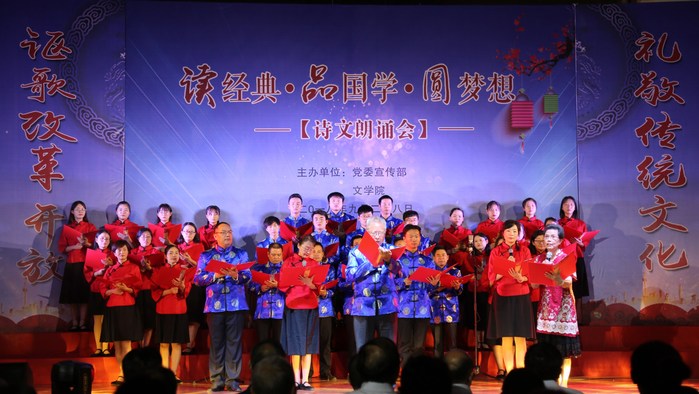 各代表队激情满怀,竞显风采,离退休老教师、受邀嘉宾、院部负责人及师生代表纷纷登台吟诵。诗文朗诵会在文学院师生代表吟诵的《中华文化,光耀千秋》中拉开帷幕。一篇篇经典诗文,回顾了我们中华民族三千年的文学发展脉络,表达了我校广大师生对传统文化的敬意尊崇以及对改革开放的赞美讴歌之情,更加坚定了同心共筑中华民族伟大复兴中国梦的信心。