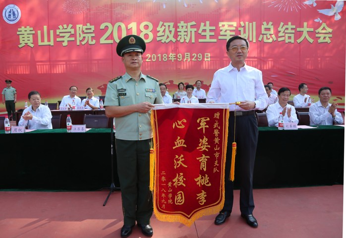 汪枫代表学校向武警黄山市支队赠送锦旗,对武警教官们的辛勤付出表示感谢。胡家俊宣读2018级新生军训工作表彰文件。主席台前排领导向军训工作优秀辅导员、队列会操优胜班级、内务整理优秀寝室代表颁发了荣誉证书和锦旗。