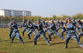 会上,14个学院代表方阵进行了分列式展示,体育学院新生表演了军体拳。