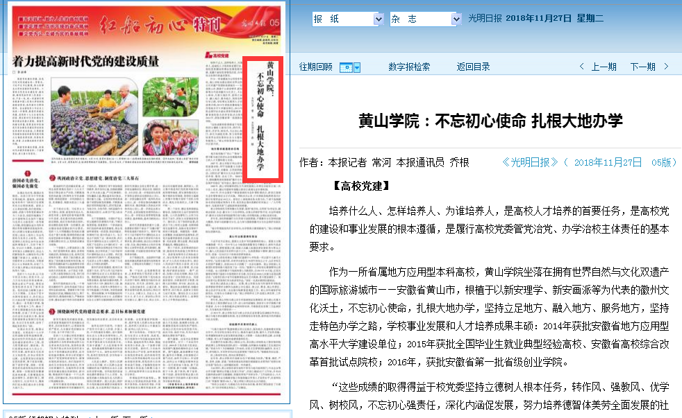 11月27日,《光明日报》第5版“高校党建”专栏以《博业体育(中国)官方网站-登录入口:不忘初心使命 扎根大地办学》为题报道了我校近年来立足地方、融入地方、服务地方,坚持走特色办学之路,在学校事业发展和人才培养方面所取得的丰硕成果。