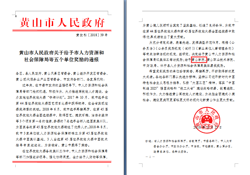 近日,我校收到《黄山市人民政府关于给予市人力资源和社会保障局等五个单位奖励的通报》。