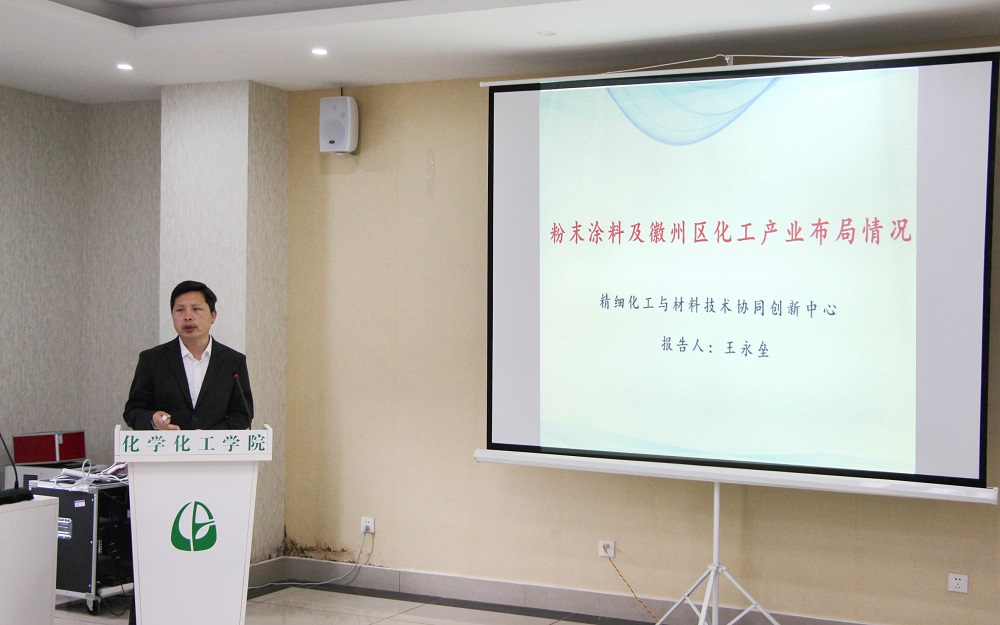 启动仪式后,王永垒博士作“粉末涂料及徽州区化工产业布局情况”的学术报告。报告主要从“粉末涂料”、“粉末涂料用聚酯树脂”和“徽州区化工产业布局”三个方面展开,详细介绍了粉末涂料和粉末聚酯的分类、合成原理及工艺、应用领域和主要检验方法等。报告会结束后,王永垒博士与参会老师进行了深入交流,整场报告既有理论高度凝练,又有实践经验总结,内涵丰富,言近旨远。