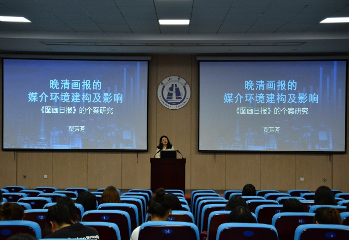 贾芳芳从晚清画报发展及特点、《图画日报》概况、《图画日报》的个案研究三个方面展开阐述。报告中贾芳芳结合大量图片分析了晚清画报各个阶段的发展历史,重点介绍了1909-1910年创刊的《图画日报》其特点和主要栏目,突出了晚清画报“图文兼并,图像启蒙和传递新闻”的特点,带领学生深入探析《图画日报》的媒介环境建构主体特征,剖析了其媒介视角的取舍和偏见。整个报告逻辑清晰,饱含哲思,主题鲜明,内容充实。