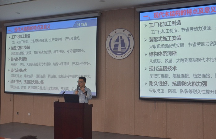 报告首先对现代木结构的特点及意义进行了分析,探讨了现代结构木材及其加工工艺,总结了现代木结构建筑结构体系和现代木结构的连接、耐久性及防火等,指出了发展现代木结构需要注意的问题,并系统介绍了当前国内在木结构建筑领域进行的工作及取得的成果。整场报告集科学性、知识性、趣味性于一体,深入浅出,内容丰富,激发了在场师生的研究兴趣。