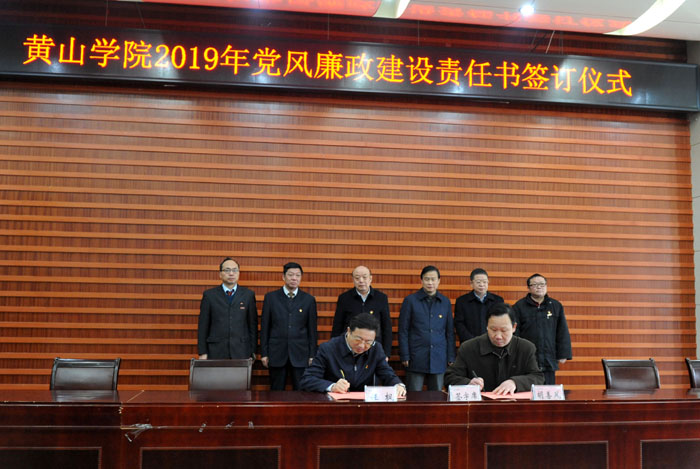2月24日上午,我校在逸夫图书馆二楼报告厅举行了2019年党风廉政建设责任书签订仪式。仪式上,校党委书记汪枫与党委副书记胡家俊,副校长胡善风,党委委员、副校长刘英旺分别签订了党风廉政建设责任书。