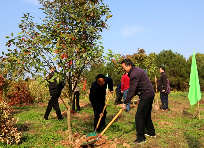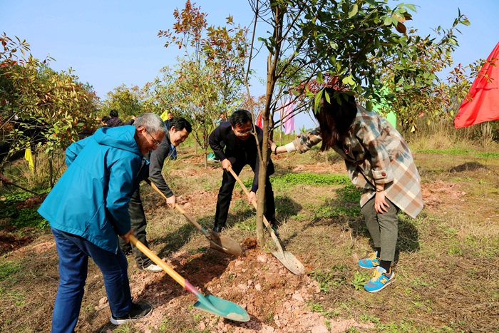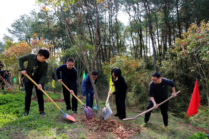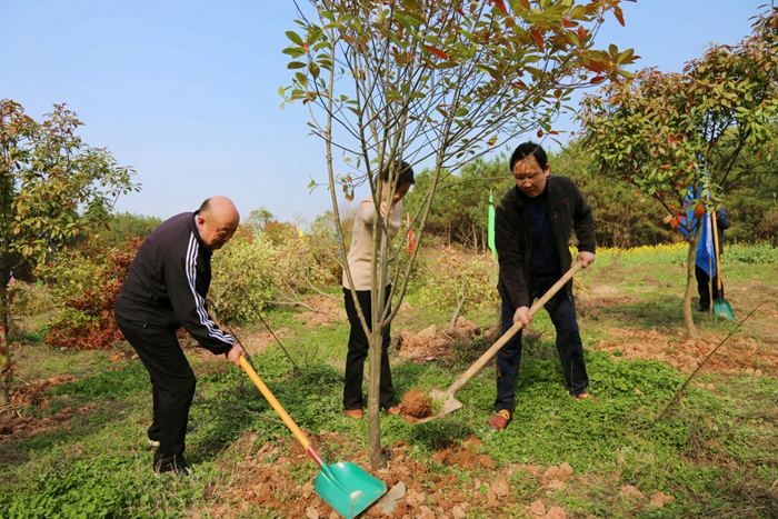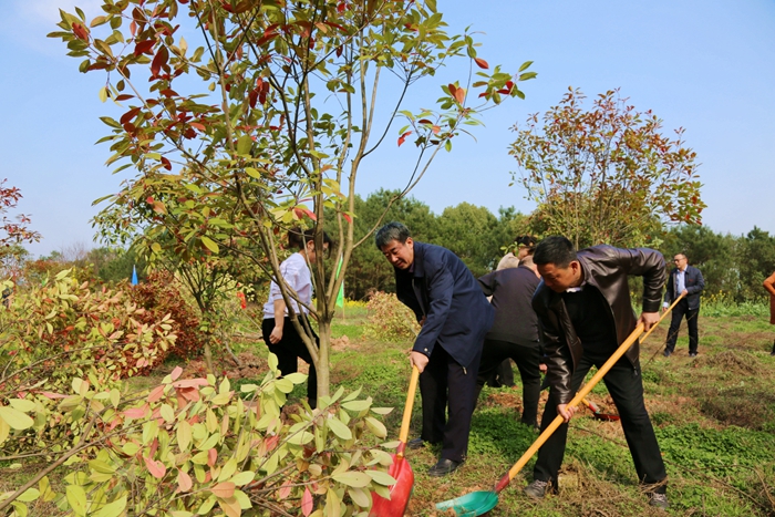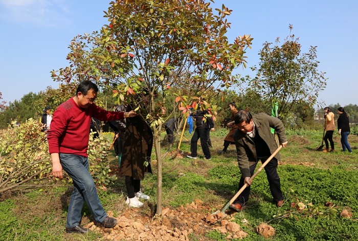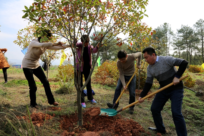 植树现场,大家有序分工、相互配合,在每个做好标记的地方进行栽种。有的拿起铁锹挖土,有的放树、扶树,有的培土并踩实树根。广大干部职工热情高涨、干劲十足,现场一片热火朝天的劳动景象。