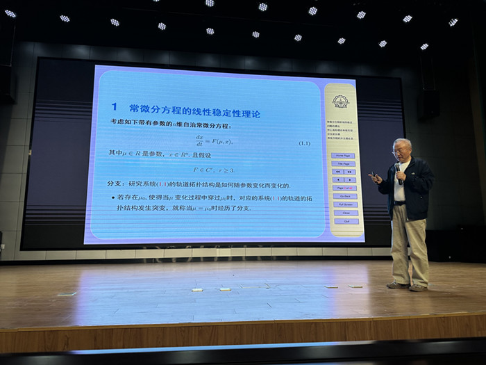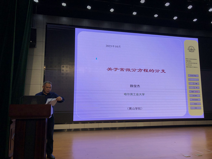 魏俊杰教授作题为“关于常微分方程的分支”的报告。报告通过例子详细地介绍了常微分方程的几类分支的概念,并将相关的理论推广到时滞微分方程。魏教授的报告深入浅出地将常微分分支理论呈现给学生,激发了学生学习分支理论的兴趣。