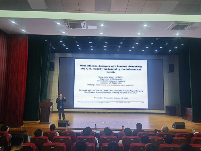 汪翔升教授作题为“Viral infection dynamics with immune chemokines and CTL mobility modulated by the infected cell density”的报告。报告详细地介绍了如何建立数学模型模拟免疫系统的趋化现象,阐明了证明解的有界性和全局存在性的关键步骤。汪教授利用动力系统理论和数值模拟,形象地描述了病毒和免疫的基本再生数如何决定病毒被清除以及免疫系统成功建立的阈值动力学。汪教授的报告启发数学专业的学生在遇到数学证明的问题时,如何寻求处理问题的方法。