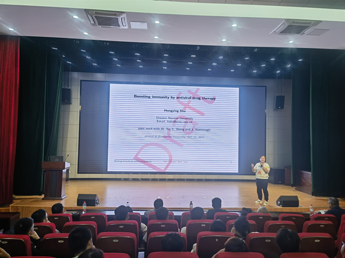 舒洪英教授介绍了利用数学建模和动力学分析研究如何通过抗病毒治疗来提高宿主的免疫力。从时滞微分动力系统角度来研究病毒感染模型的动力学行为,探索病毒感染过程的机理,利用最优控制、敏感度分析,数值模拟及数据拟合等方法,研究抗病毒药物治疗及免疫反应对病毒感染的影响;分析治疗的持续时间、药物疗效、免疫时滞及治疗成功率之间的关系;估计病毒感染的关键参数值;分析如何选取药物治疗法,减少耐药性的蔓延,同时保证治疗效果。舒教授的报告把数学知识应用到生物问题中去,开阔了数学专业学生学习数学的视野。