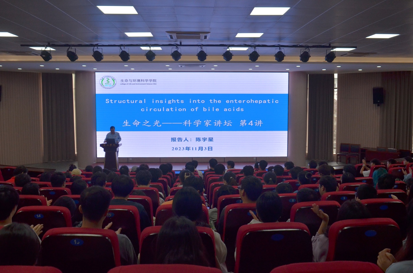 11月3日,应我校生命与环境科学学院邀请,中国科学技术大学生命科学与医学部教授、博士生导师陈宇星教授来我校参加“生命之光”科学家讲坛,并在文端楼二楼报告厅为生命与环境科学学院师生作题为“Structural insights into the enterohepatic circulation of bile acids”的学术报告。生命与环境科学学院党政领导、师生共300余人参加报告会,报告由生命与环境科学学院党委副书记万志兵主持。