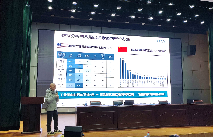 赵坚毅围绕数据分析在各行业的应用、数据分析成为职场必备技能及企业对数字化人才的要求等三个方面展开讲座。他指出,在数字化与数智化的背景下,智能革命已经势不可挡,数据分析已经渗透到各个行业,正在成为职场的必备技能,企业的数字化转型与数字化人才的培养迫在眉睫,这为当今的大学生就业提供了很好的就业方向和就业机会。