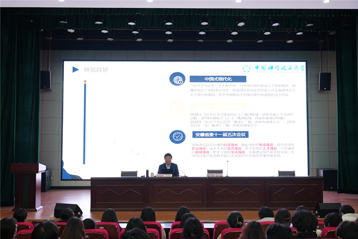 12月20日下午,行知讲坛第二百零一讲在横江校区教学楼一楼报告厅举行。中国科学技术大学刘志迎教授作题为“中国式现代化背景下安徽‘七个强省’建设”主题报告,经管院近350名师生参加报告会。报告会由经济管理学院院长赵士德教授主持。
