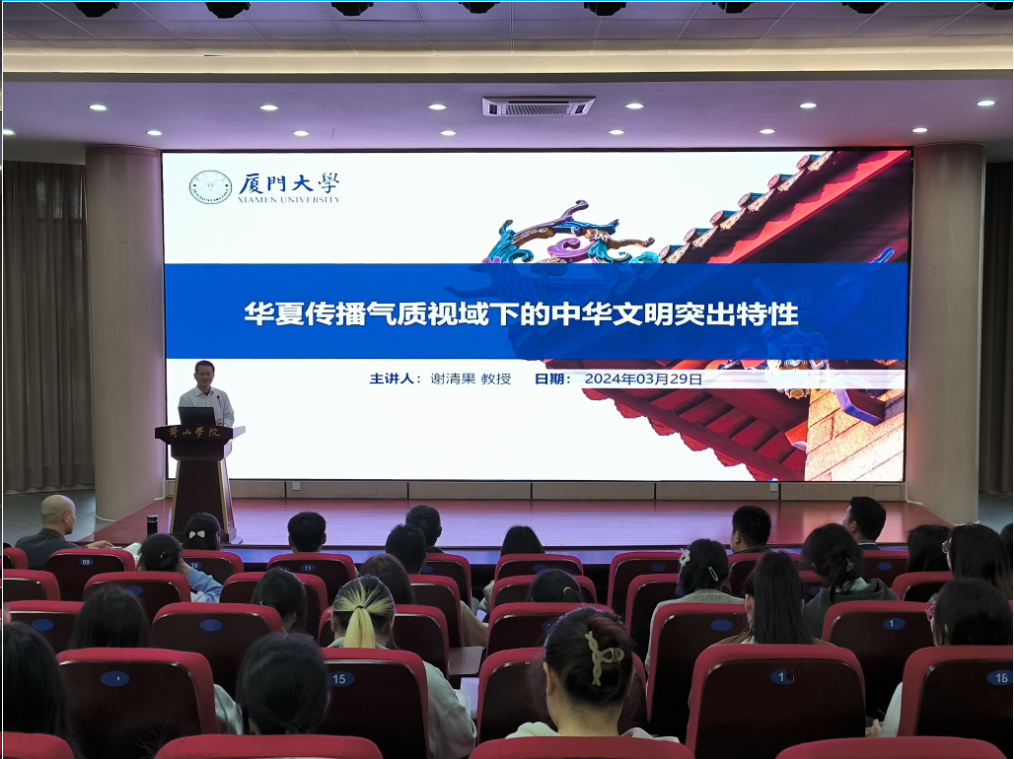 3月29日下午,行知讲坛第二百零三讲在率水校区文端楼二楼报告厅举行。厦门大学谢清果教授作题为“华夏传播气质视域下的中华文明突出特性”主题报告,文化与传播学院近120名师生参加报告会。报告会由文化与传播学院副院长吕正兵主持。