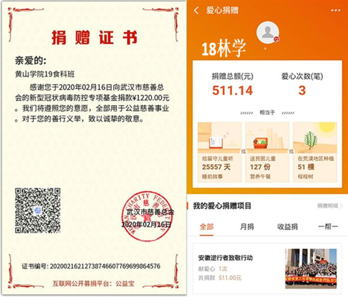 疫情期间,该院学子以集体或个人的名义捐款捐物,其中19级食品科学与工程班捐款1220元、18级林学班捐款511.14元,来自各班级的37名同学也通过慈善机构捐款和捐献口罩等医护用品。