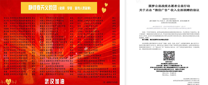该班安庆籍学生王欣成也参加线上义教活动,他主要负责每日宣传材料的制作、学生与教师的一对一分配等管理服务工作,他还加入南京圆梦志愿者中心组织的“战疫情”线上志愿者活动,担任分组副组长,负责甄别互联网上各类新闻信息,及时传播官方媒体报道,组织组员设计海报、制作视频、撰写文案为湖北地区加油鼓劲,同时自发募捐口罩等医用物资寄往湖北医院。