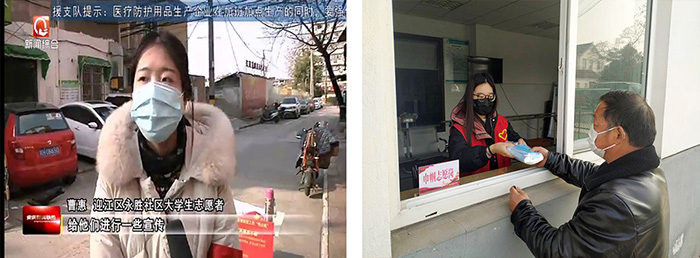 看到社区招募志愿者消息后,17新闻班曹惠同学第一时间来到安庆市迎江区永胜社区卡点处报名,自1月31日起协助工作人员值班,耐心地对社区防疫卡点进出人员、车辆严格进行检测排查,上门登记人员信息、发放出入证,发放新型冠状病毒肺炎防控明白纸等材料。