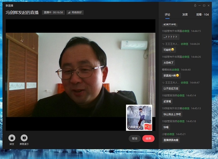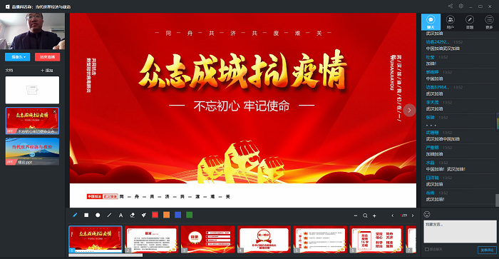 2月24日,马克思主义学院专兼职老师采取多种形式开始思想政治理论课线上教学活动,冯剑辉教授利用企业微信进行《中国近现代史纲要》课第一次直播,吴云峰教授利用学习通开展《毛泽东思想和中国特色社会主义理论体系概论》课第一次直播,叶继发老师利用学习通平台开展《当代世界经济与政治》课的第一次直播。孙海霞老师则以翻转课堂的形式,利用学习通和QQ群课堂相结合的方式开展了她《马克思主义基本原理概论》课的第一次直播,孙海霞老师还利用了春节假期,组织学生围绕“防控疫情、人人有责”的主题进行网上调研访谈,引导学生关注疫情。