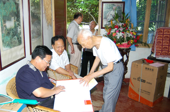 校领导的到来,黄教授显得十分高兴,快步迎出门来,与大家热情握手,互致问候。汪良发书记向黄教授送上生日贺卡,恭祝他生日快乐,健康长寿;校领导还向老教授赠送了生日礼物。黄澍教授热情招呼大家,并高兴地拿来刚出版的大型个人书画作品集请大家欣赏。亲切的叙谈,爽快的笑声,黄老教授90华诞的喜庆气氛一时弥漫在这个雅称“时雨轩”的居室内。