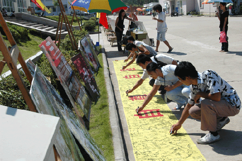 9月18日,艺术系团总支配合院宣传部、团委在南区组织开展了“爱国、奋进、自尊、自强”为主题的纪念“九一八”签名活动。虽然天气炎热,但来往的大学生们都积极地在写有“爱国、奋进、自尊、自强”的条幅上郑重签下自己的名字。不过两小时的时间,签名的学生就达300余人。现场除签名活动外,艺术系团总支还举办了纪念“九一八”宣传画和图片展览,十几幅作品都是艺术系的教师和学生精心设计制作而成,鲜活的图片资料加上艺术化地设计处理,每一幅作品都凝聚了师生们强烈的爱国热情。
