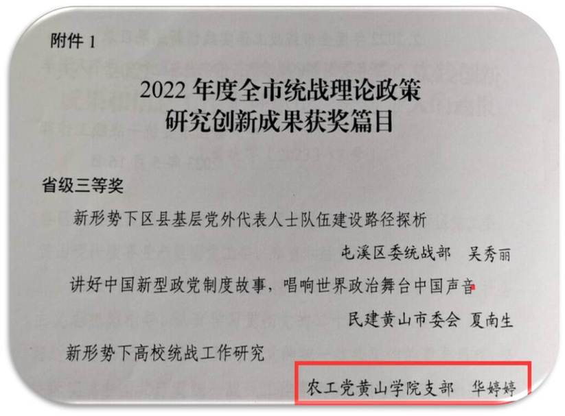 健全党外代表人士数据库,加强党外代表人士日常培养,五年来,我校党内外代表人士相继担任各级“两代表一委员”13名,1名成员推荐担任黄山市知联会副会长,1名成员推荐担任黄山市侨联副主席,安排4名成员到地方挂职锻炼。2022年我校“侨胞之家”获省侨联通报表扬,博业体育(中国)官方网站-登录入口归国华侨联合会获2023年“黄山市侨务工作先进集体”荣誉称号,3名成员获“黄山市侨务工作先进个人”荣誉称号。