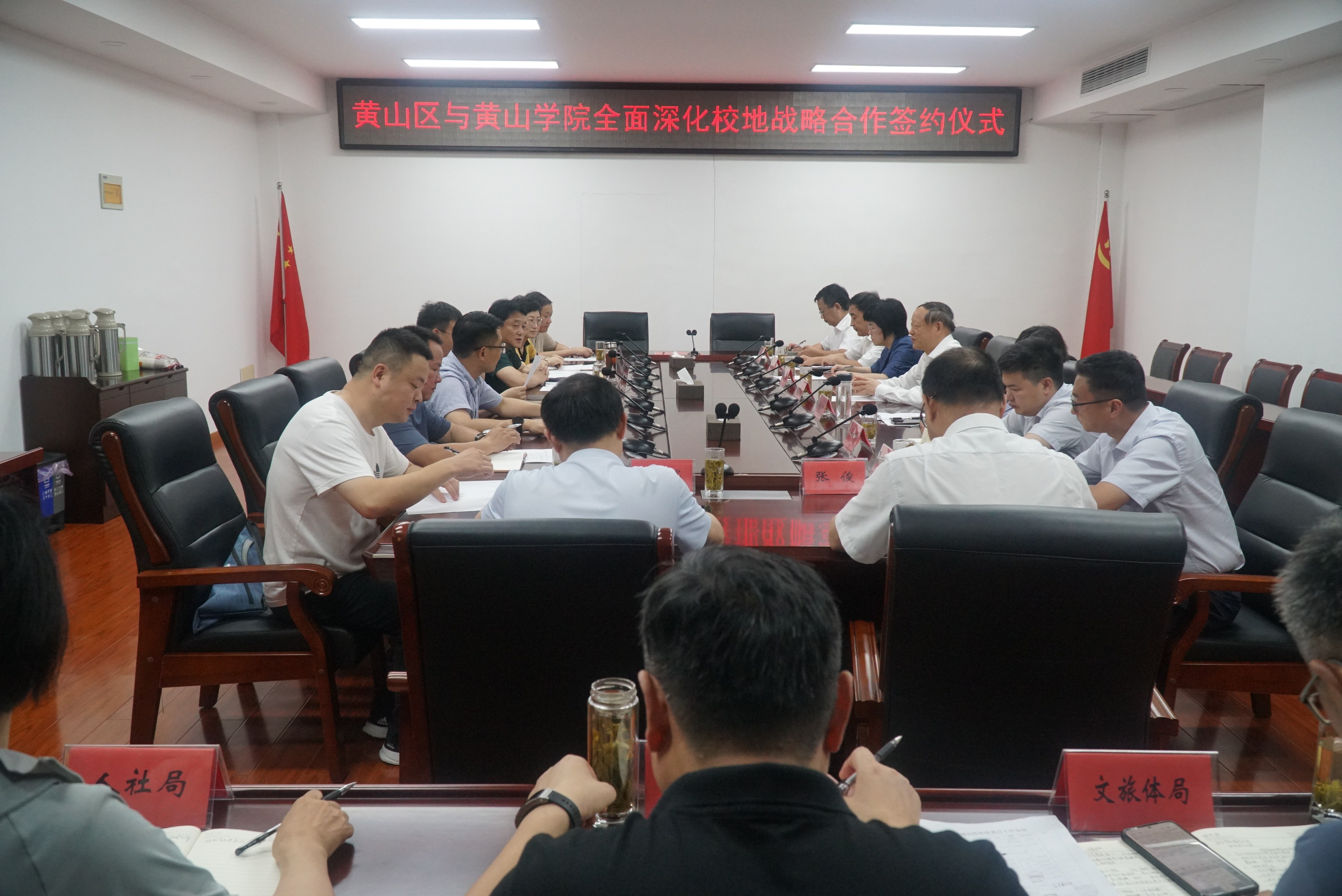 7月16日上午,我校与黄山区政府全面深化校地战略合作签约仪式在政务新区3号楼三楼区委常委会议室举行。校党委书记李铁范,党委副书记章文静,黄山区委书记张旭,黄山区人民政府区长吴小胜,区委常委、组织部长胡毅,区人民政府副区长刘先英等出席签约仪式。签约仪式由吴小胜主持。