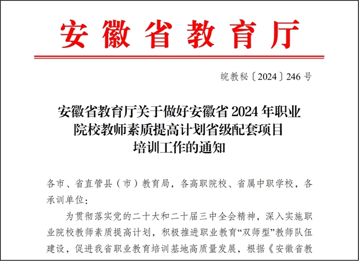 8月12日,省教育厅发布《关于做好安徽省2024年职业院校教师素质提高计划省级配套项目培训工作的通知》,正式公布各项目承训单位及相关工作要求。我校名列34家承训单位之中,成为4个省级教师培训项目的承训单位,其中中职“双师型”教师职业技能提升项目2项,高职“双师型”教师职业技能提升项目和创新项目各1项,实现学校在省级教师培训项目上的历史性突破。