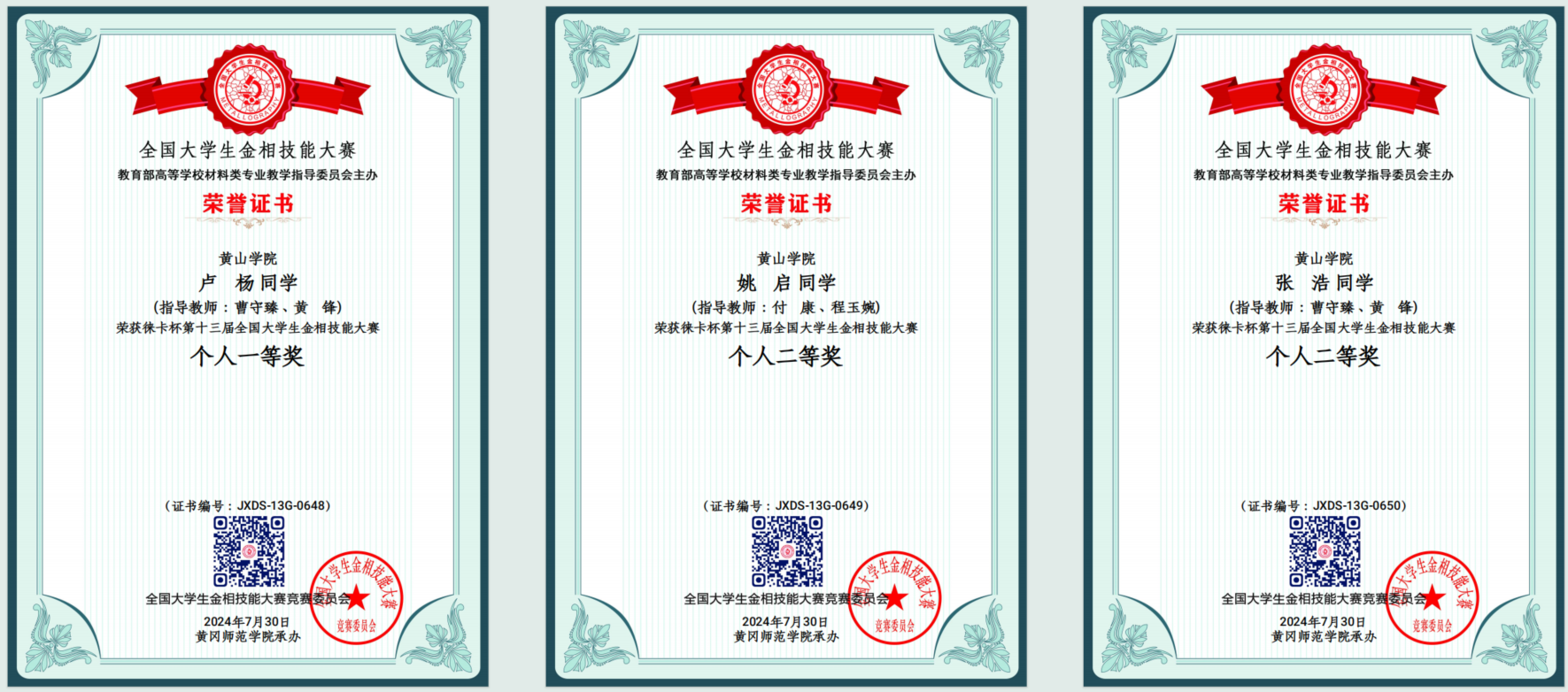 近日,由教育部高等学校材料类专业教学指导委员会主办的第十三届全国大学生金相技能大赛决赛在黄冈师范学院举行。机电工程学院3名同学代表学校参加比赛,与531所高校1898名选手同台竞技。经过激烈角逐,2022级的卢杨荣获一等奖,2023级的张浩和2023级的姚启均荣获二等奖,创我校该赛事成绩历史新高。