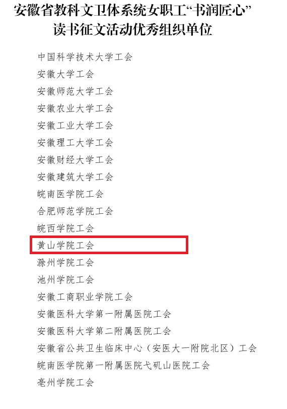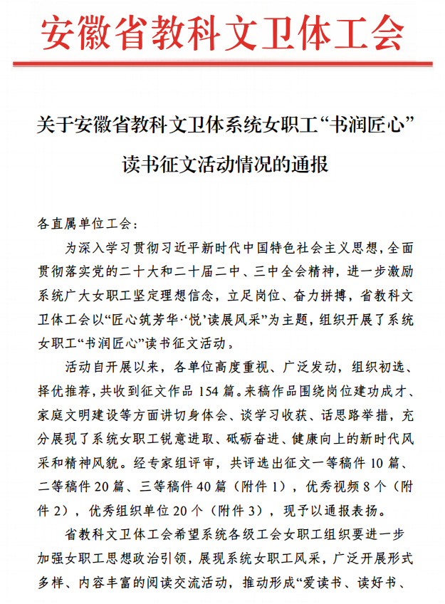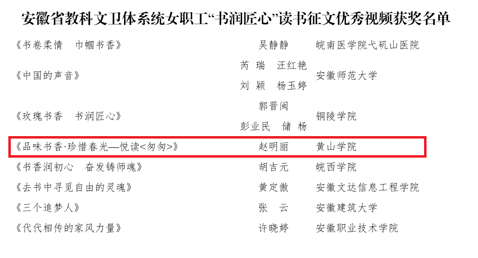 近日,安徽省教科文卫体工会下发文件,通报“书润匠心”读书征文活动评选结果。我校科研处徐日莉老师作品《亲子共读—给孩子最好的陪伴》获二等奖;旅游学院郭慧捷老师作品《以书籍之光 锚人生之志》获三等奖;文化与传播学院赵明丽老师作品《品味书香·珍惜春光—悦读<匆匆>》获优秀视频奖,校工会获“优秀组织单位”荣誉称号。
