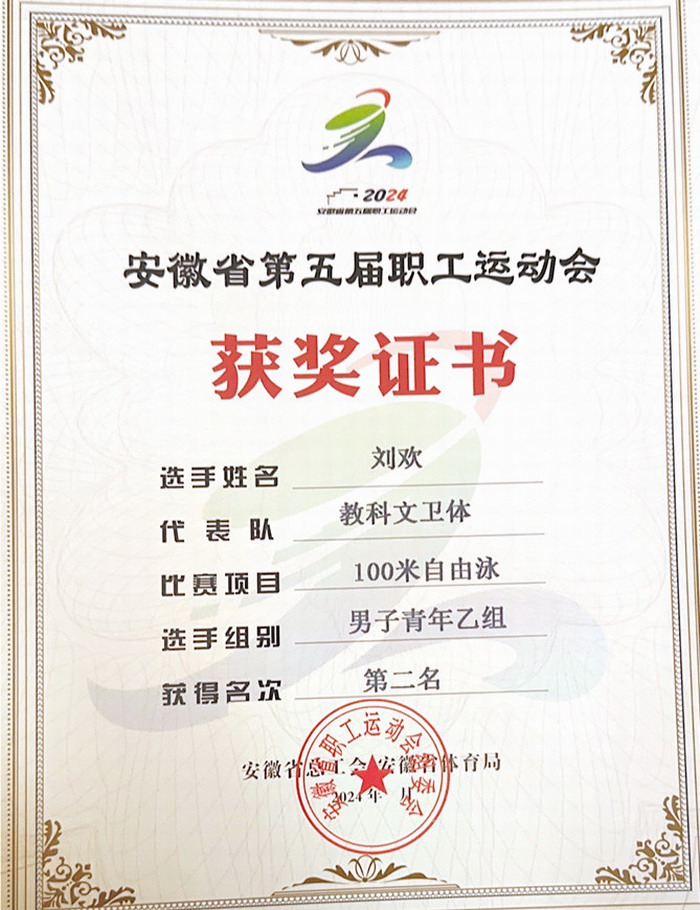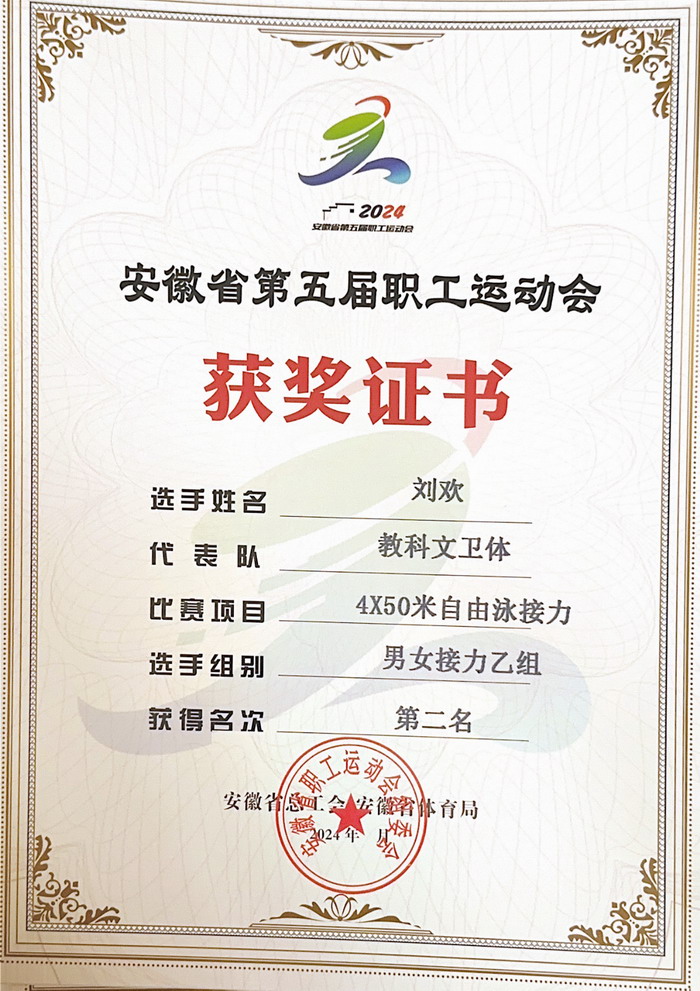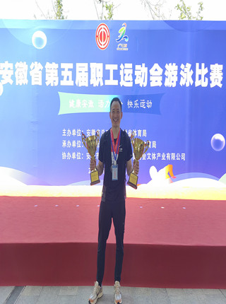 9月6日,安徽省第五届职工运动会游泳比赛在安庆市体育中心游泳馆落下帷幕。我校体育学院教师刘欢代表省教科文卫体工会参加了比赛,在男子青年乙组100米自由泳和50米蝶泳以及4*50米男女混合自由泳接力项目中均荣获第二名。