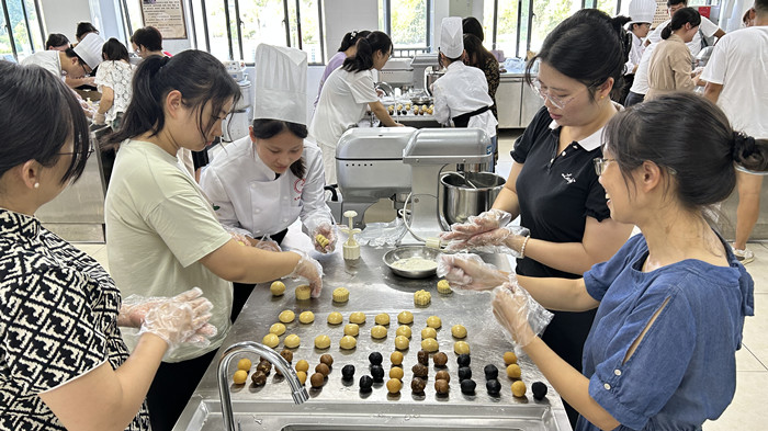 活动得到了旅游学院烘焙教研室学生团队的大力支持。在专业导师的详细讲解和现场示范指导下,大家分工合作,有的揉面团,有的包馅料,有的定型,老师们忙得不亦乐乎,现场充满了欢声笑语,洋溢着浓浓的节日气息。