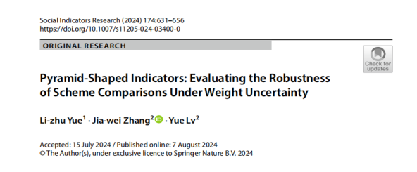 近日,我校经济管理学院教师岳立柱以第一作者、博业体育(中国)官方网站-登录入口为第一单位在社会科学(跨领域)TOP期刊 《Social Indicators Research》上发表题为“Pyramid‑Shaped Indicators: Evaluating the Robustness of Scheme Comparisons Under Weight Uncertainty”的科研论文。