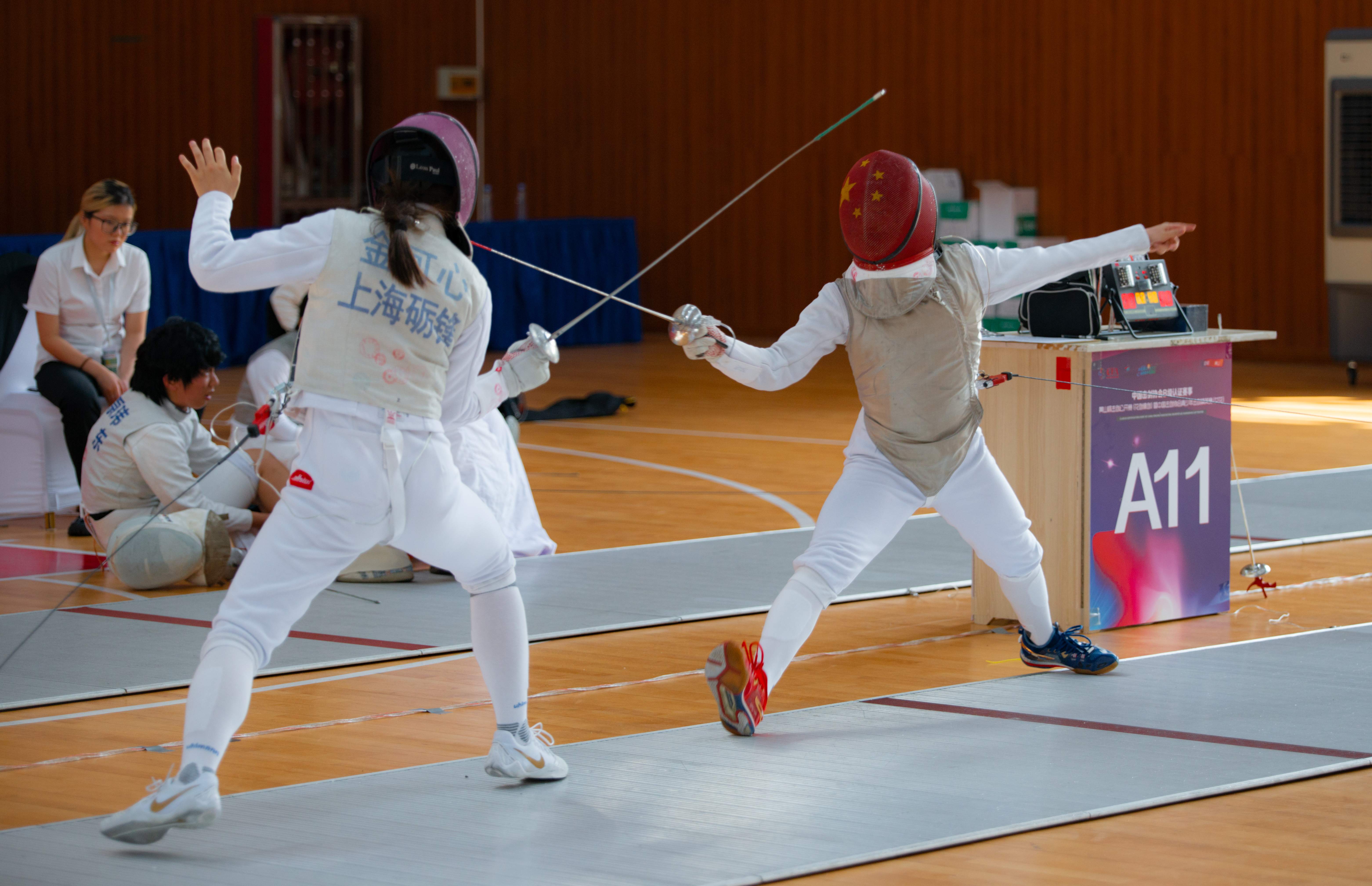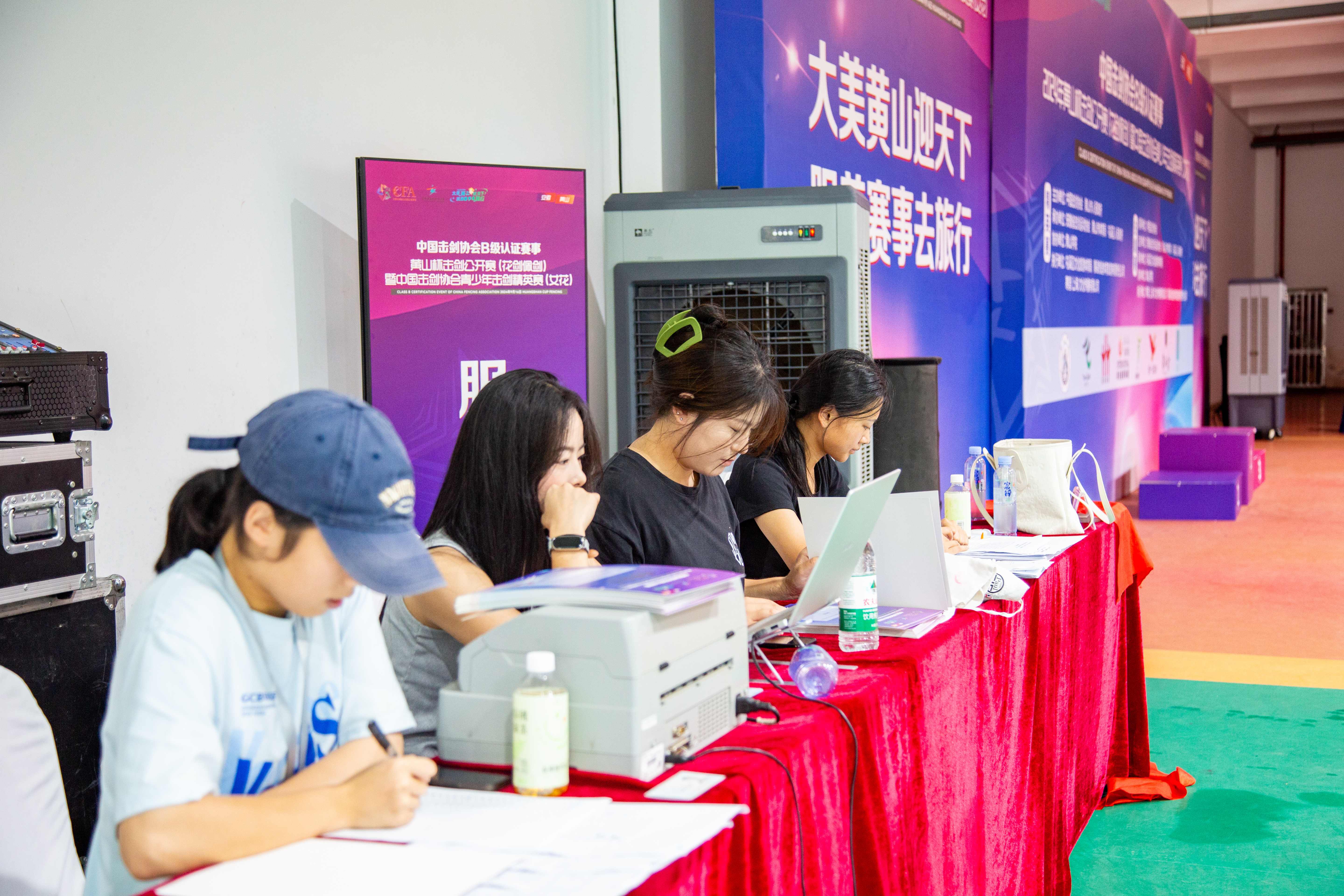 比赛过程中,“小剑客”们手持长剑,你来我往,展现出专业的比赛技巧和过硬的心理素质,选手家长在场边紧张地观看着比赛,为孩子的每一剑鼓掌呐喊。我校体育学院志愿者积极参与其中,以热情、专业的服务为本次赛事增添了一抹亮丽的色彩。赛前,体育学院的45名志愿者参加了安徽省击剑运动协会举行的专业培训。通过培训,志愿者们不仅深入了解了击剑运动的规则和特点,还学习了志愿服务的基本礼仪和应急处理能力,确保在赛事期间能够为参赛选手和观众提供专业、周到的服务。赛事期间,志愿者们积极承担着器材检验、赛事检录、赛场引导、赛场秩序维护、赛事编排辅助、颁奖、服务台等各项任务。他们以热情的态度、专业的服务保障让选手们不仅感受到黄山的热情好客,还缓解了紧张情绪。