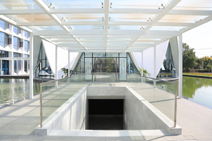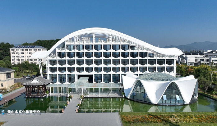 黄山水文化体验中心位于黄山市徽州区经济开发区,建筑面积7407平方米,地上五层,一层为水文化展示厅,二至五层为矿泉水疗养会所,地下室为矿泉水新品发布会场。无极雪矿泉水引自黄山山麓蜀源村深岩隙水,村中有数孔历史悠久古井,井水含丰富养生矿物质,村庄周边有千亩郁郁葱葱的向日葵田。主楼的屋顶设计成水流的轮廓,附楼混凝土薄壳呈向日葵形态,与徽州井亭遥相呼应。