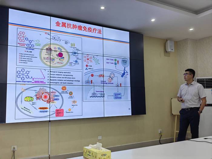 报告会上,苏志教授首先围绕金属类抗肿瘤药物耐药性的问题,提出了开发线粒体靶向型金属类药物的设计策略,重点介绍了钌/铱类金属配合物的结构修饰与改善耐药性的构效关系。随后,苏志教授详细阐述了线粒体靶向型金属类药物引起的细胞死亡特征,细胞信号通路的激活以及在免疫治疗方面的应用,分享了成功的金属抗肿瘤药物开发依赖深入的生物学理解、创新的化学合成技术以及严格的临床验证这一科学理念。报告会后,苏志教授同现场教师进行了热烈的互动交流。