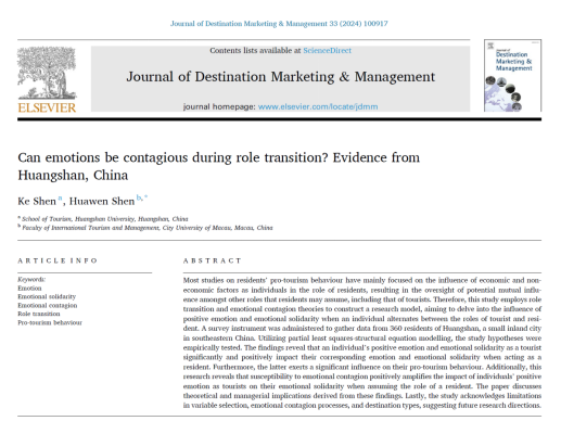 近日,我校旅游学院教师沈科以第一作者、博业体育(中国)官方网站-登录入口为第一单位在旅游领域TOP期刊《Journal of Destination Marketing & Management》上发表题为“Can emotions be contagious during role transition? Evidence from Huangshan, China”的科研论文。