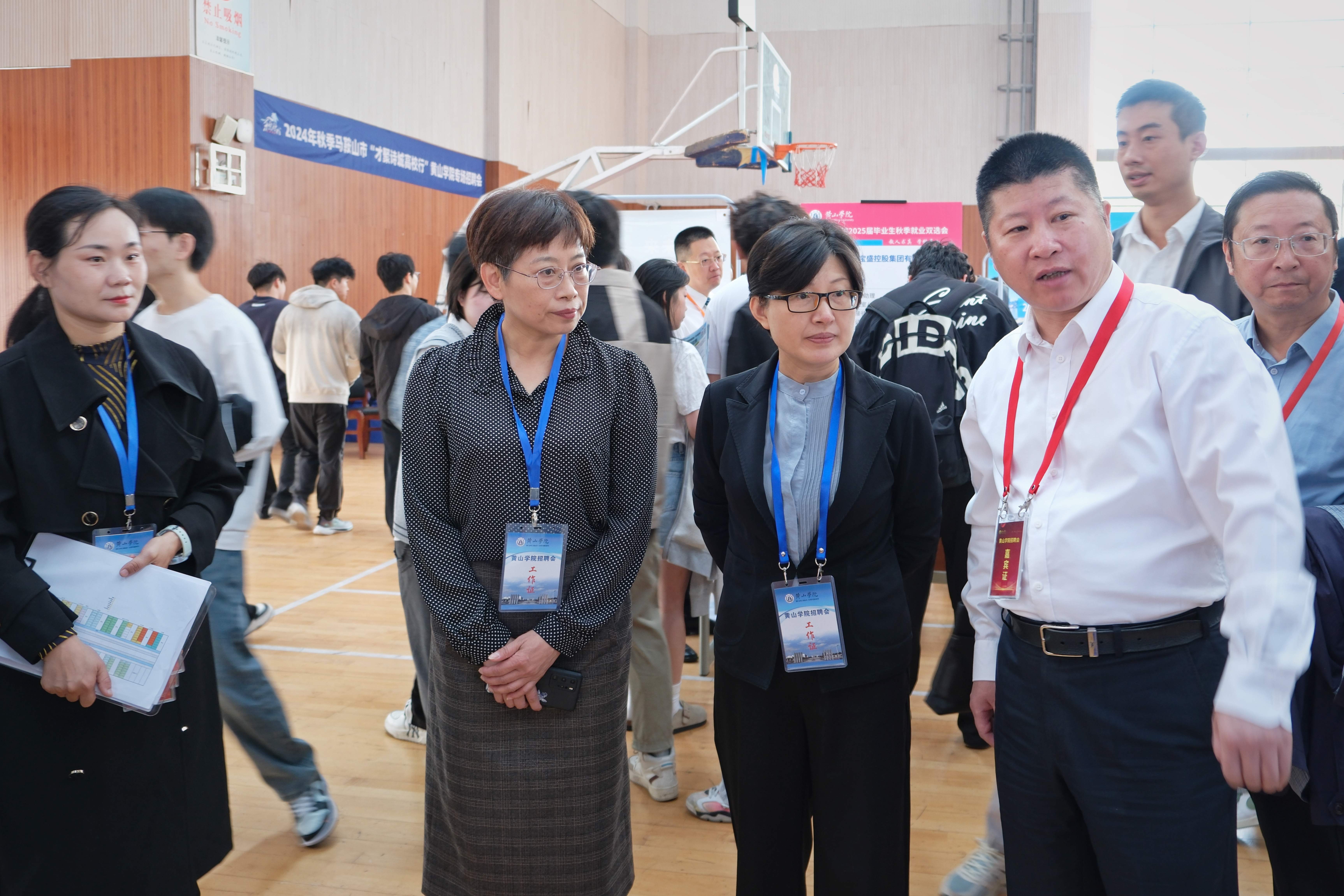 章文静深入双选会现场指导工作,询问参会毕业生的就业意向和求职准备情况,现场进行就业指导和答疑解惑,嘱咐同学们要树立正确的择业观、就业观,从实际出发选择职业和岗位,抓住就业黄金期,实现高质量就业。相关学院负责人、辅导员也来到双选会现场,调研了解相关行业用人单位的招聘需求,并有针对性地向毕业生推介岗位和指导求职。