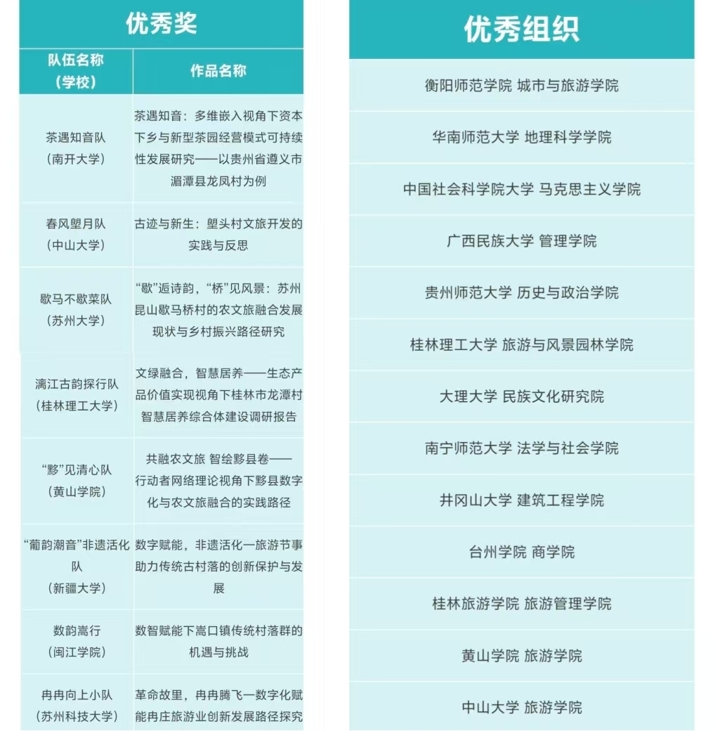 近日,第九届全国大学生“发现传统村落”调研大赛奖项名单公布。在本届大赛中,我校旅游学院旅游管理专业费凤祺等同学在王娟教授的指导下,创作的作品《共融农文旅智绘黟县卷——行动者网络理论视角下黟县数字化与农文旅融合的实践路径》荣获主赛单元优秀奖。同时,旅游学院荣获优秀组织奖。