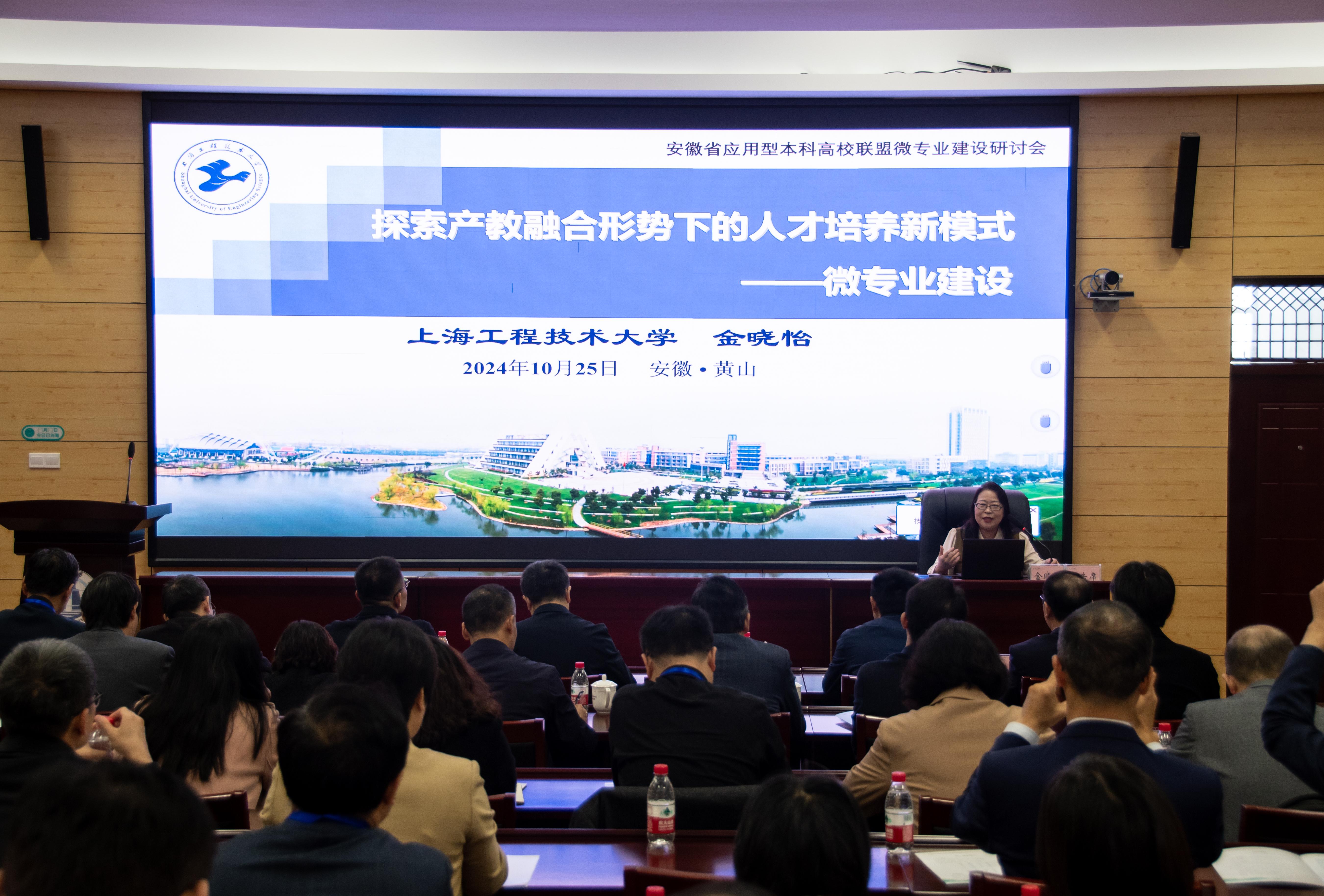 会议邀请了上海工程技术大学教务处副处长兼党委教师工作部副部长金晓怡教授作专题报告。金晓怡以“探索产教融合形势下的人才培养新模式”为主题,分享了上海工程技术大学在微专业建设方面的实践经验和研究成果。她详细介绍了微专业的定义、特征、运行机制,并结合具体案例,展示了微专业在促进学生个性化发展和满足社会需求方面的独特优势。