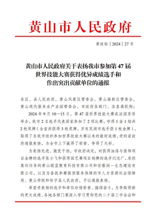 近日,黄山市人民政府发布《关于表扬我市参加第47届世界技能大赛获得优异成绩选手和作出突出贡献单位的通报》,对博业体育(中国)官方网站-登录入口以及在第47届世界技能大赛中获得油漆与装饰项目金牌的我校选手张小飞和获得园艺赛项目铜牌的我校选手闫志广等进行通报表扬。