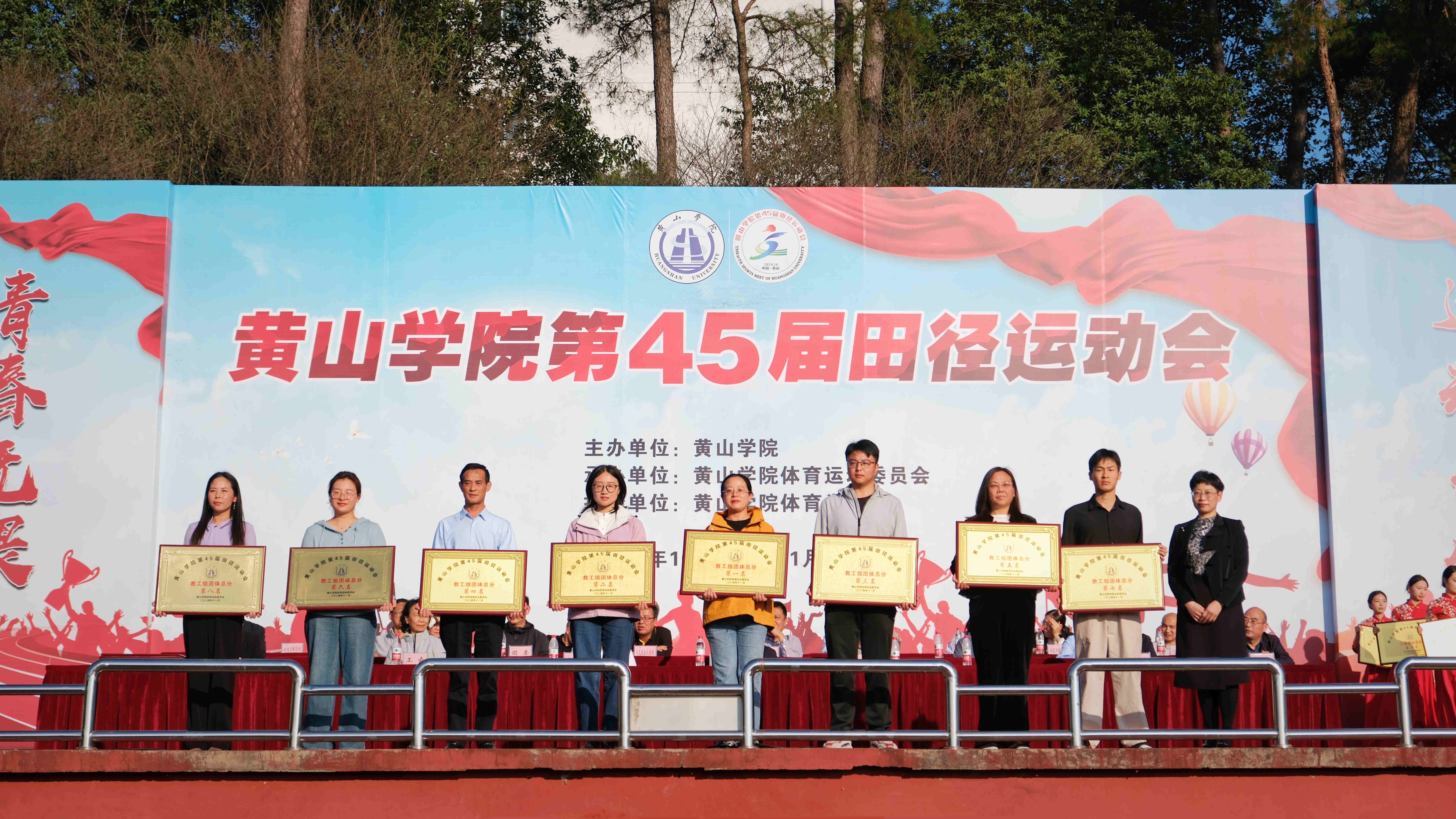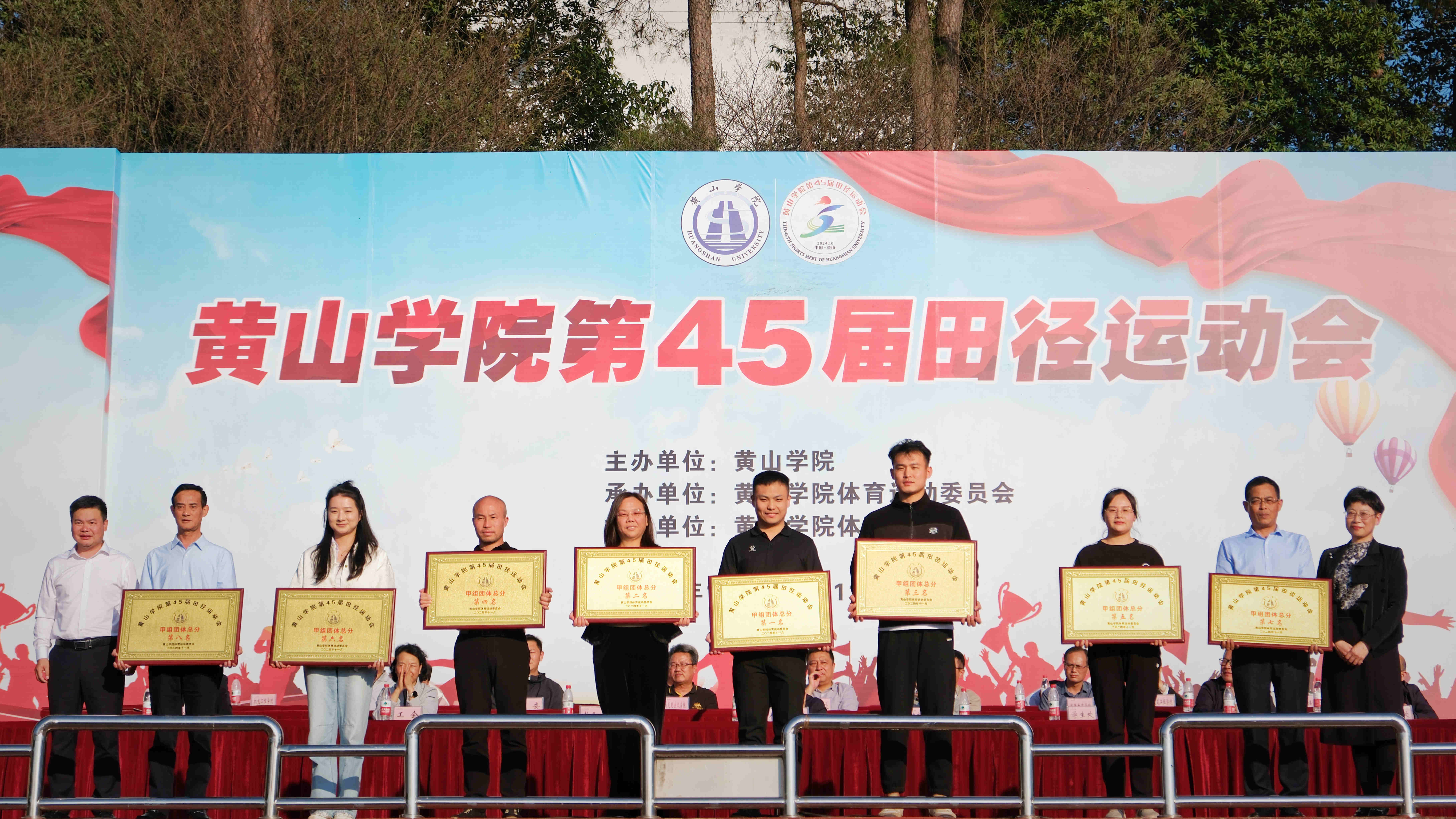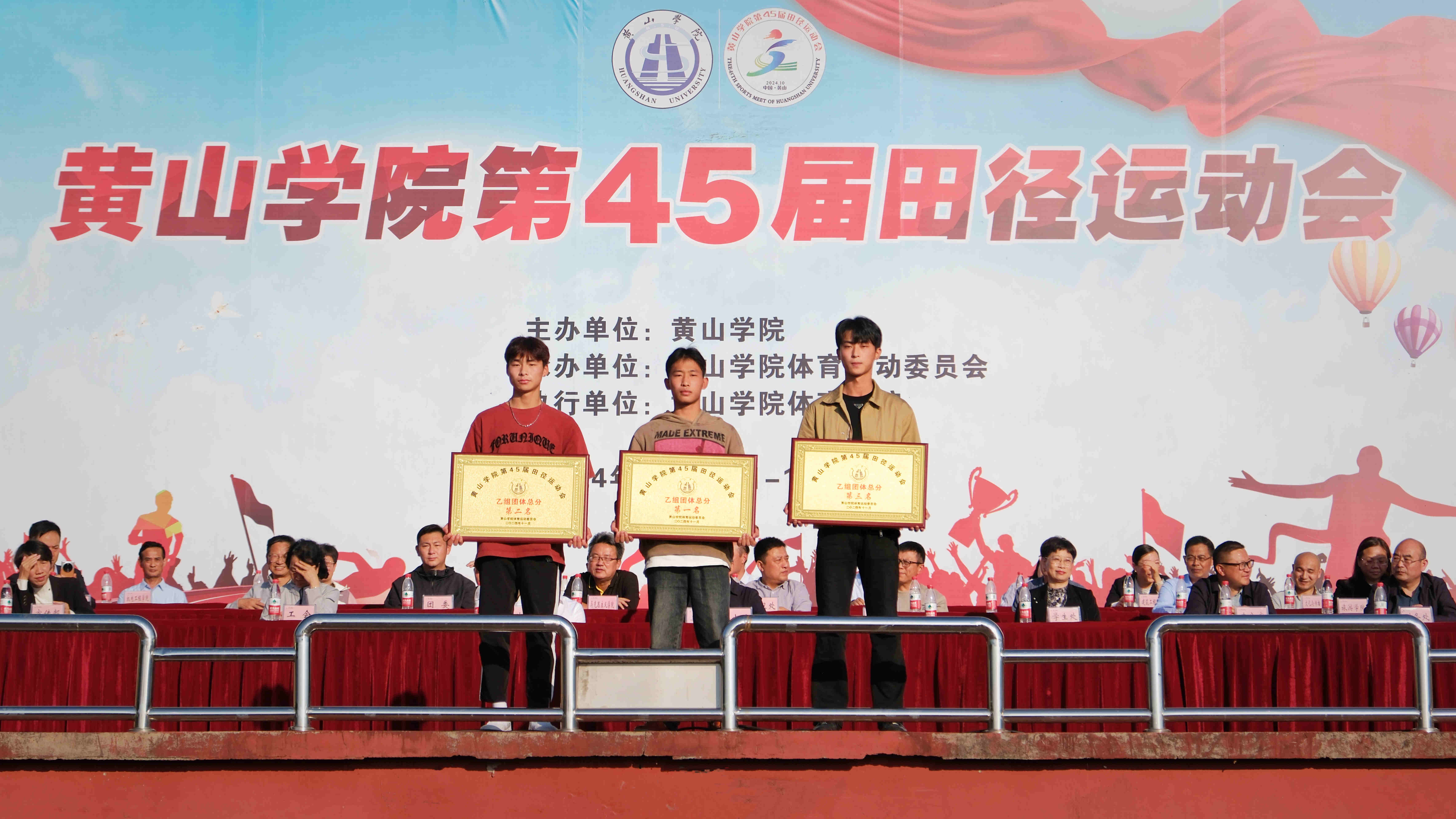 闭幕式在庄严的《中华人民共和国国歌》声中拉开帷幕。校体委副主任、体育学院党总支书记、运动会总裁判长窦卉平同志宣读了第45届田径运动会团体成绩。经济管理学院、旅游学院、生命与环境科学学院、数学与统计学院、建筑工程学院、文化与传播学院、文学院、机电工程学院分获甲组团体总分前八名;23体教班、23社体班、24体教班分获乙组团体总分前三名;机关二分工会、机关三分工会、生命与环境科学学院分工会、机电工程学院分工会、旅游学院分工会、机关一分工会、机关四分工会、化学化工学院分工会获得教职工团体总分前八名;国际教育学院、艺术学院、信息工程学院、教育科学学院、外国语学院、化学化工学院、建筑工程学院、经济管理学院、数学与统计学院、体育学院获得“体育道德风尚奖”;保卫处、后勤集团获得特别贡献奖;教育科学学院、旅游学院、文学院、经济管理学院、生命与环境科学学院、化学化工学院、外国语学院、机电工程学院分获2023年度学生体质健康测试达标优良率团体奖前八名。与会领导为获奖单位颁发了奖牌。