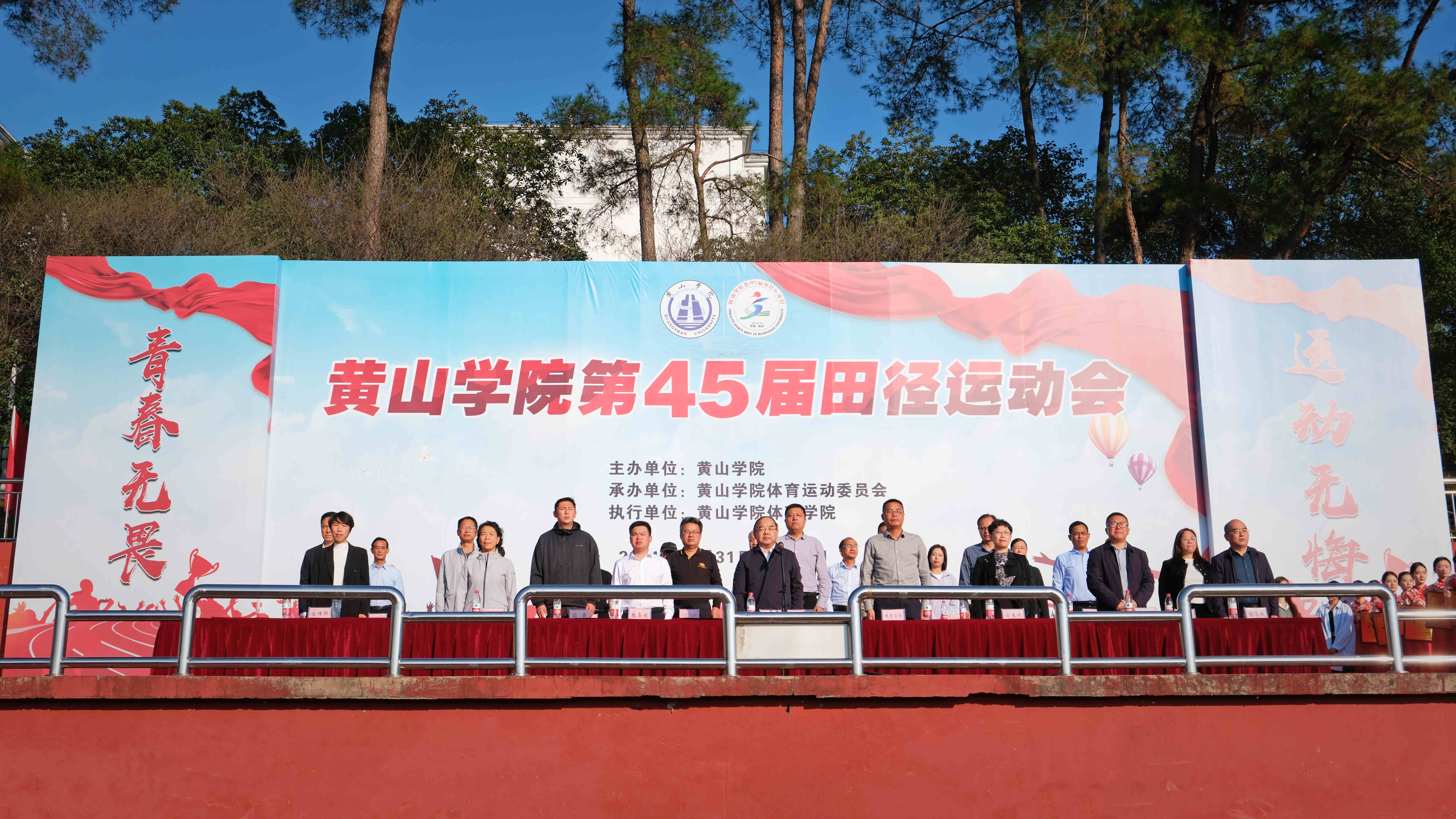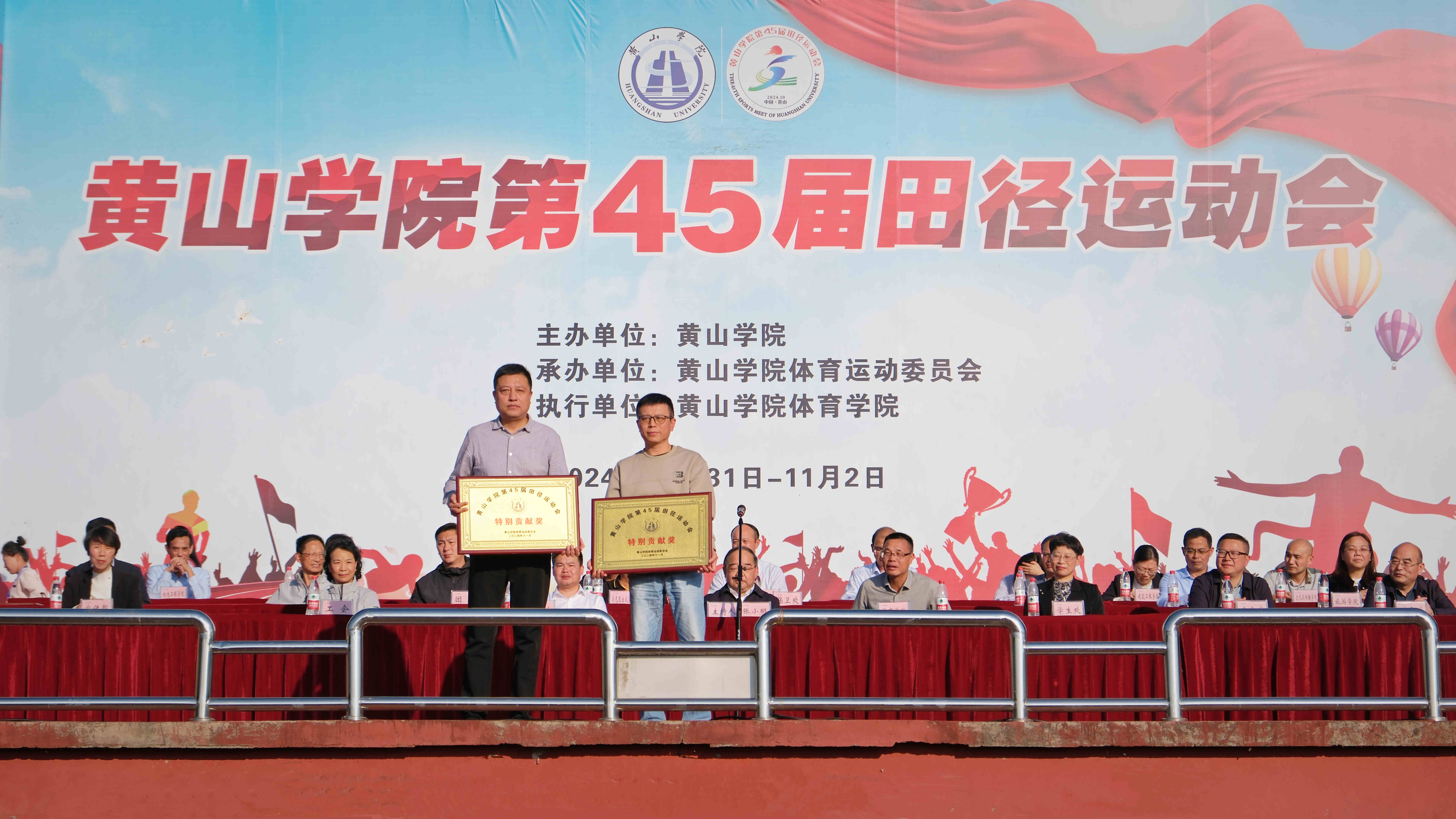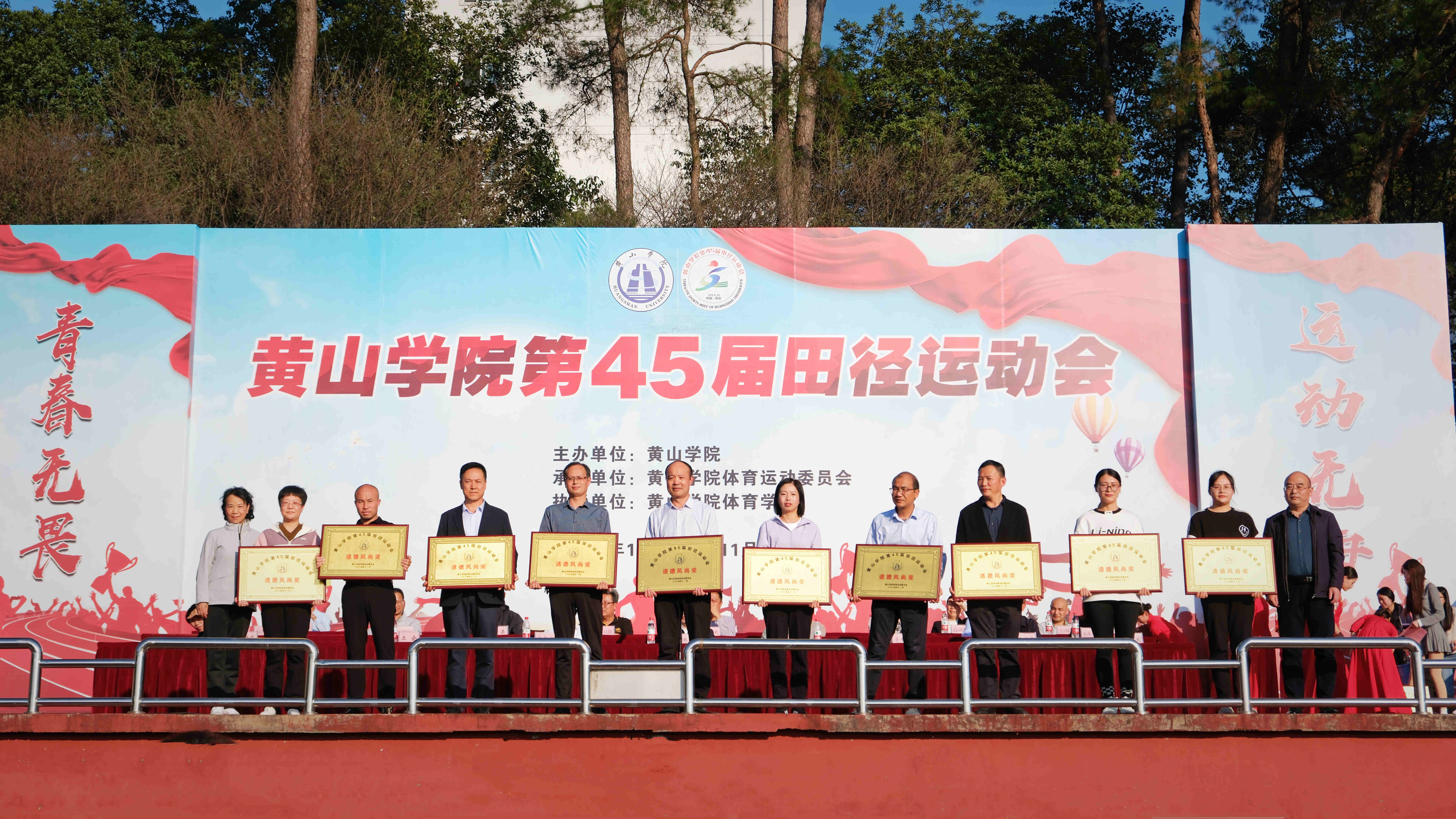 闭幕式在庄严的《中华人民共和国国歌》声中拉开帷幕。校体委副主任、体育学院党总支书记、运动会总裁判长窦卉平同志宣读了第45届田径运动会团体成绩。经济管理学院、旅游学院、生命与环境科学学院、数学与统计学院、建筑工程学院、文化与传播学院、文学院、机电工程学院分获甲组团体总分前八名;23体教班、23社体班、24体教班分获乙组团体总分前三名;机关二分工会、机关三分工会、生命与环境科学学院分工会、机电工程学院分工会、旅游学院分工会、机关一分工会、机关四分工会、化学化工学院分工会获得教职工团体总分前八名;国际教育学院、艺术学院、信息工程学院、教育科学学院、外国语学院、化学化工学院、建筑工程学院、经济管理学院、数学与统计学院、体育学院获得“体育道德风尚奖”;保卫处、后勤集团获得特别贡献奖;教育科学学院、旅游学院、文学院、经济管理学院、生命与环境科学学院、化学化工学院、外国语学院、机电工程学院分获2023年度学生体质健康测试达标优良率团体奖前八名。与会领导为获奖单位颁发了奖牌。