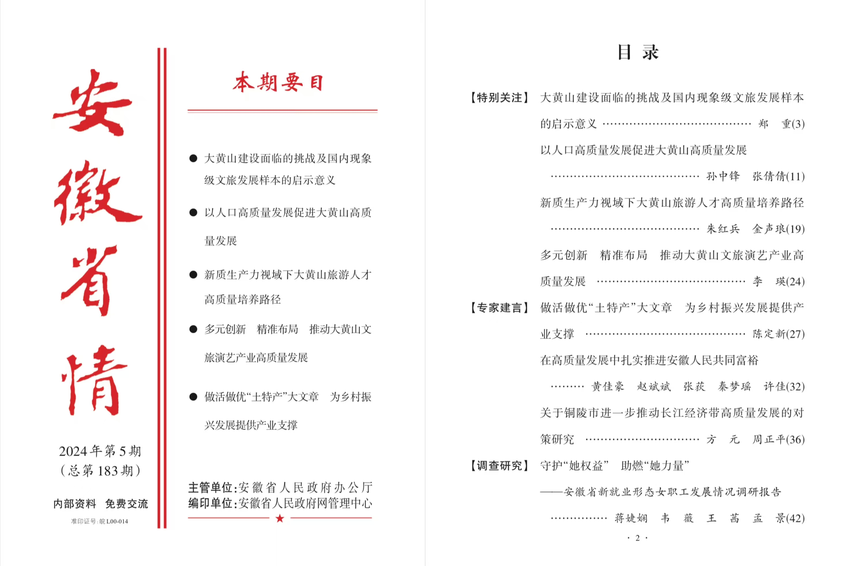 近日,我校旅游学院教师金声琅、朱红兵撰写的《新质生产力视域下大黄山旅游人才高质量培养路径》、李瑛撰写的《多元创新精准布局推动大黄山文旅演艺产业高质量发展》两篇资政文章,被安徽省人民政府办公厅内刊《安徽省情》(2024年第5期)“特别关注”专栏刊载。