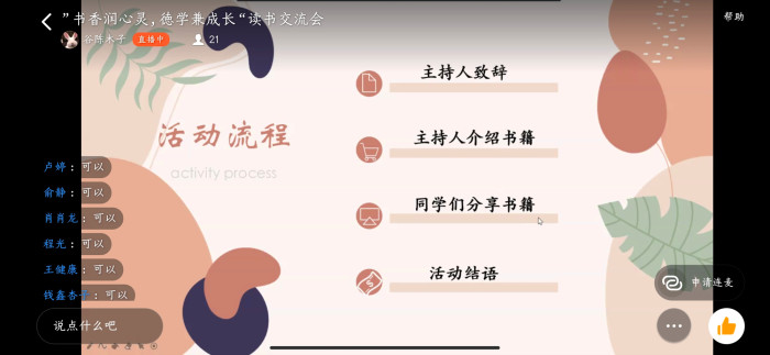 此次交流会系该院百场读书会系列活动之一。读书交流会以线上方式开展,不仅为居家的同学们交流开拓了新平台,也营造了良好的读书氛围。